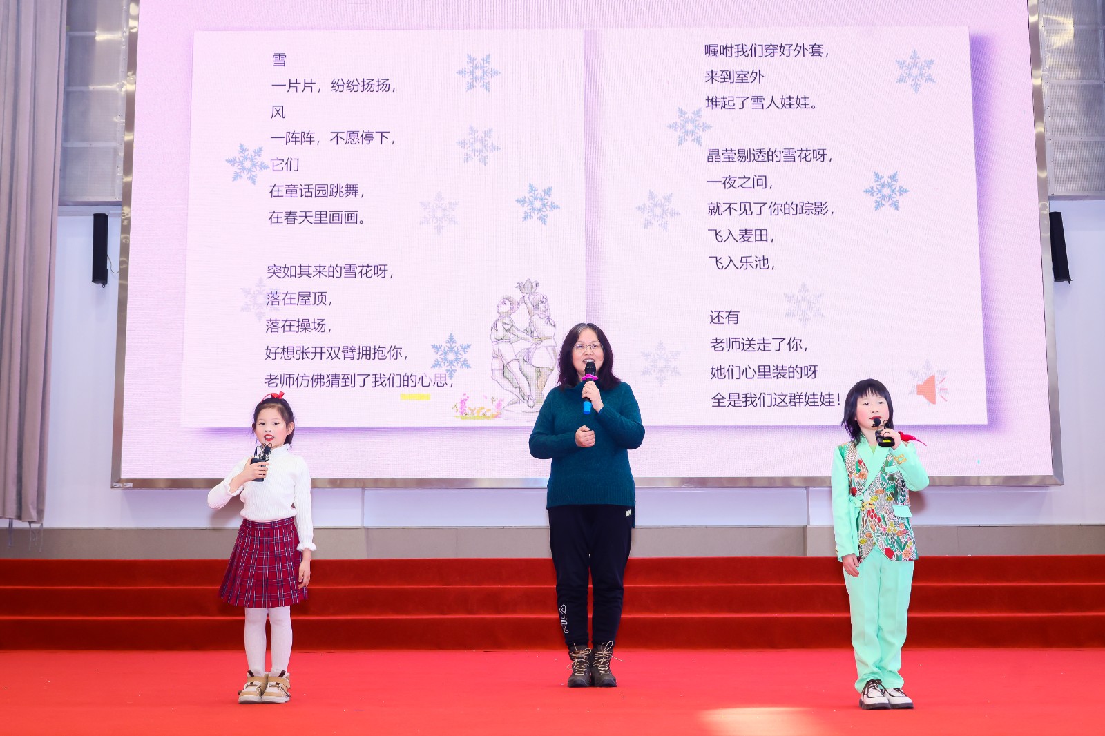 小朋友愛寫詩,我們的老師也喜歡寫詩。二年(nián)級級部主任魏芳老師帶來(lái)了自(zì)己的原創小詩《雪花·情》,邀請(qǐng)了二(1)班的張晨曦和二(3)班的華思墨兩位小朋友和她一起深情演繹。